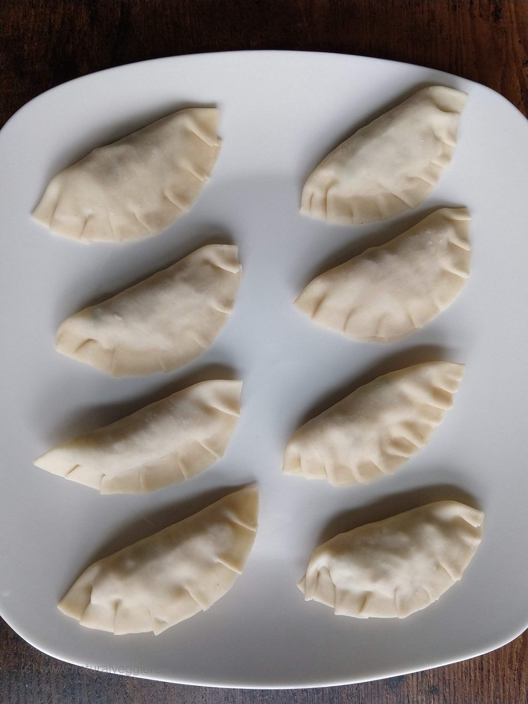 Spoon 1 tablespoon of the mixture to the center of each potsticker wrapper. Fold over, moisten and seal the edges of the wrapper. Then gently pinch and fold the edges at intervals to make a beautiful restaurant-like pattern (as seen in pictures above).